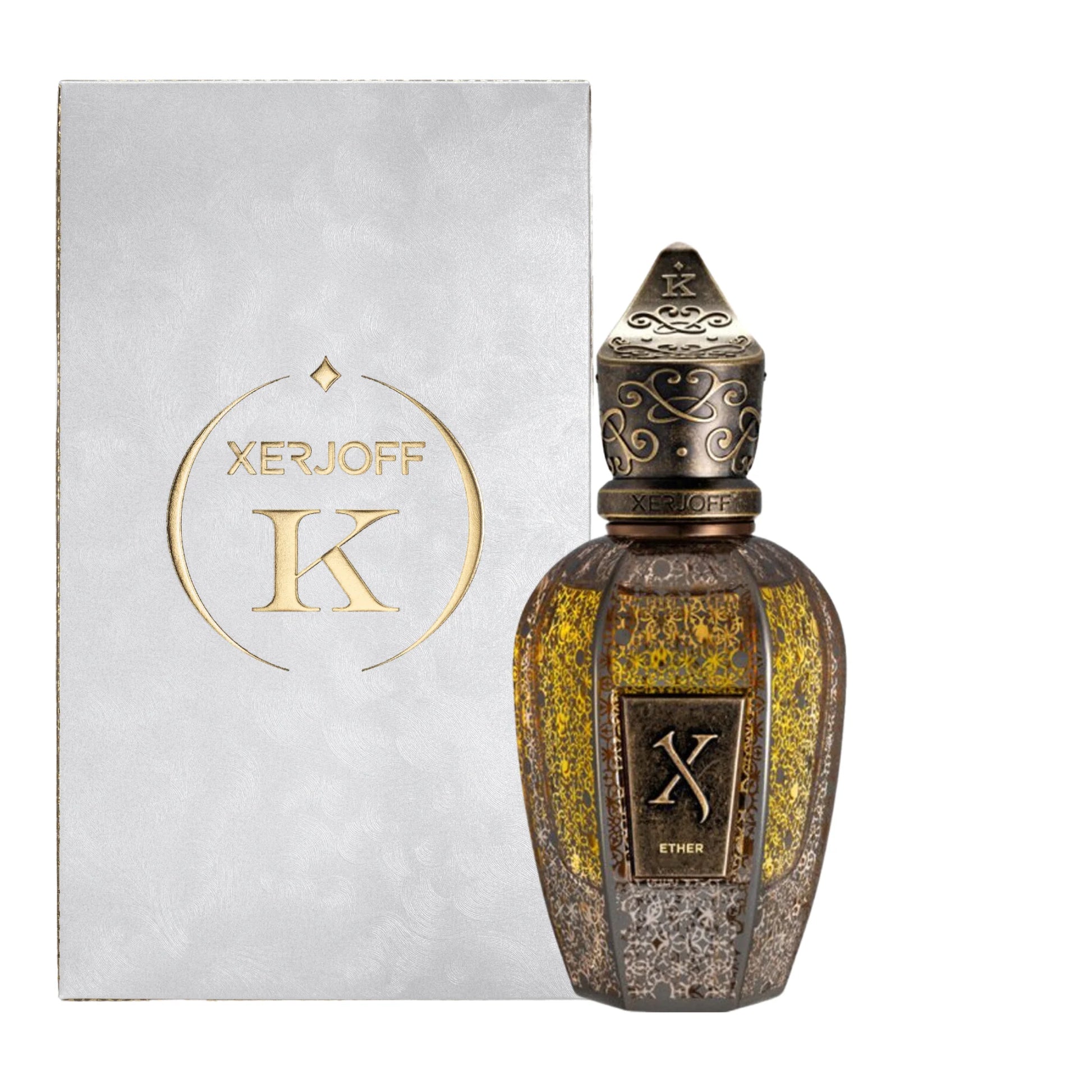 Xerjoff 的 Ether 是一款適合中性及中性的香水。這款新香水於 2023 年推出,以巴西橙子、卡拉布里亞佛手柑、保加利亞玫瑰、柑橘、阿馬爾菲檸檬和孜然的活潑混合開場。中調包括安息香、西伯利亞松、古爾詹香脂、莎草油或納加莫塔油、薰衣草和快樂鼠尾草,而基調則以沉香木、焦糖、馬達加斯加香草、麝香和檀香增添深度。