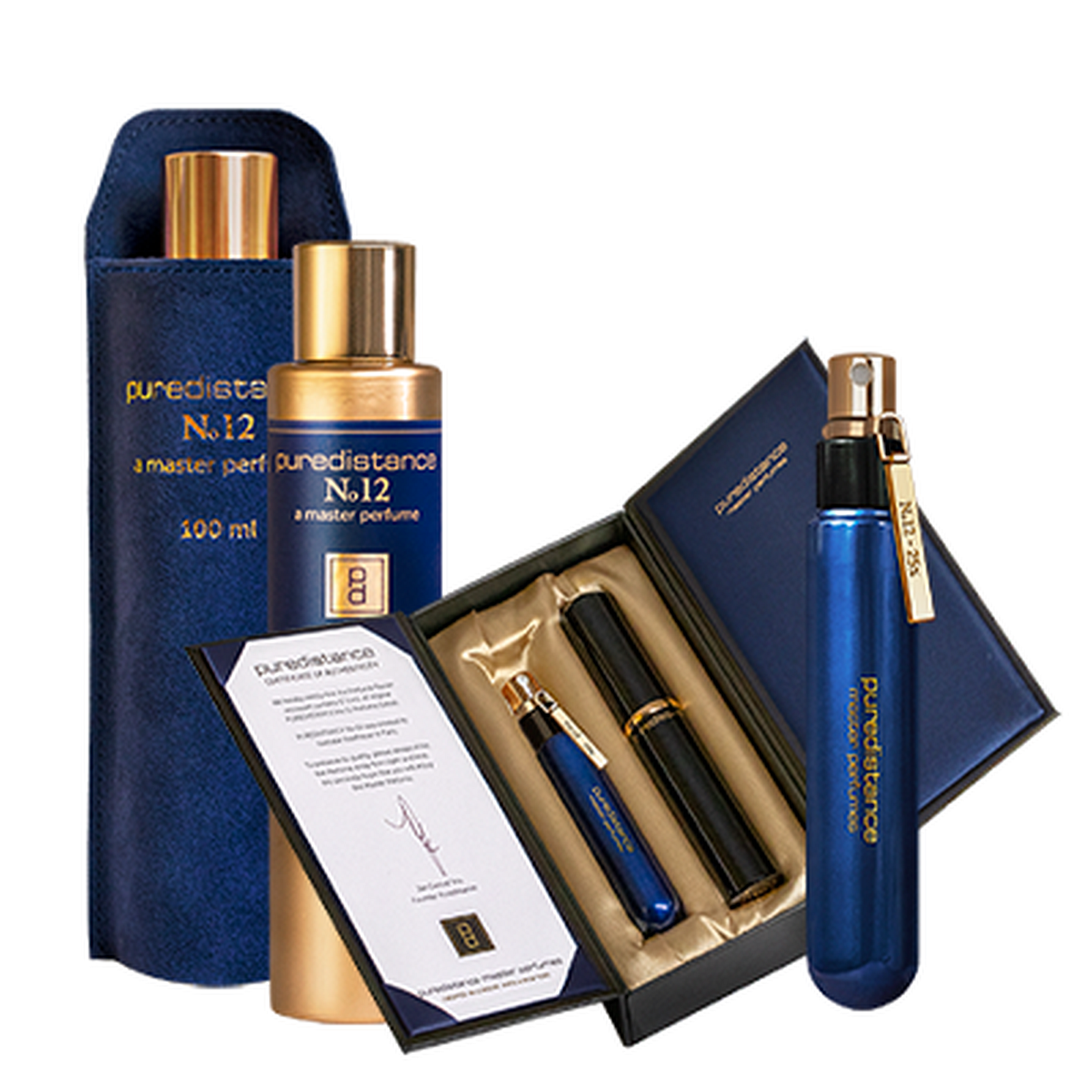 100 毫升 Puredistance 大師香水 No.12 Parfümflakon,裝在經典黑金色盒子中,配有藍色手柄。